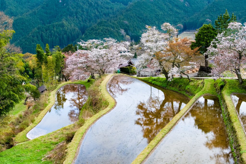 从伊势本街道通往真福院约 1.5 公里的参道上,种植超过 500 棵山樱花,花季时宛如一条延伸在山间的樱花隧道。由于地势起伏、高低差明显,加上园内多为古老山樱,三多气的花期通常比平地的染井吉野樱稍晚,也因此能享受较长的赏樱时节。樱花倒映在梯田水面上的景色,静谧而富有层次,展现出与都市赏樱截然不同的春日风情。
