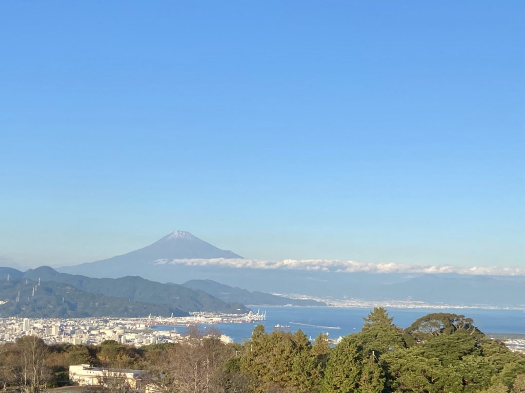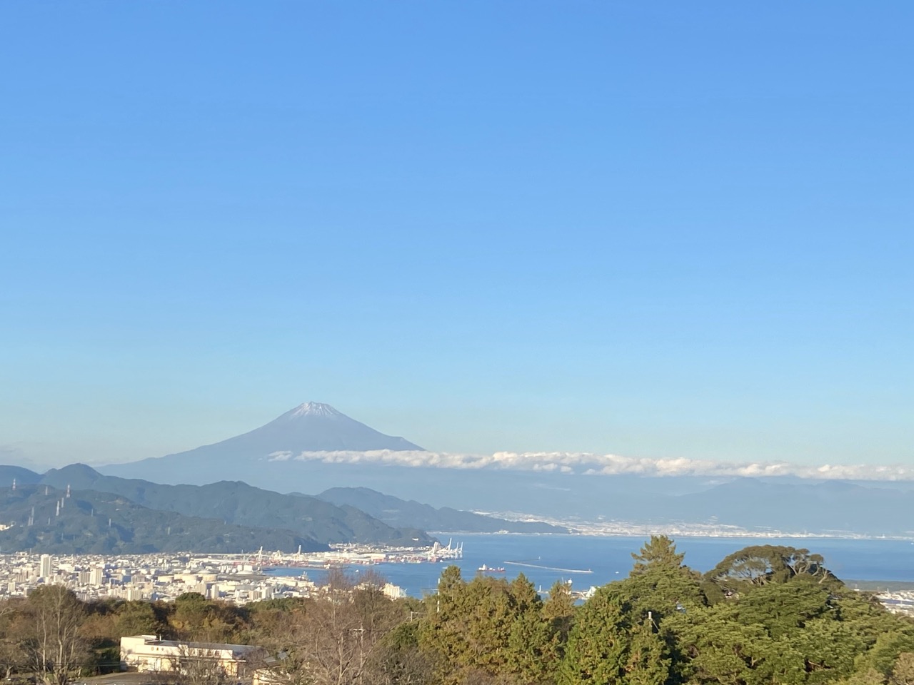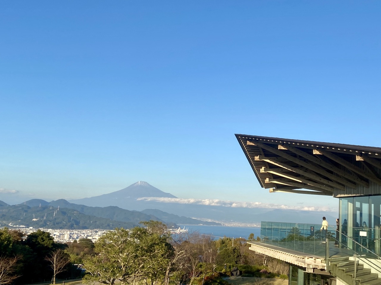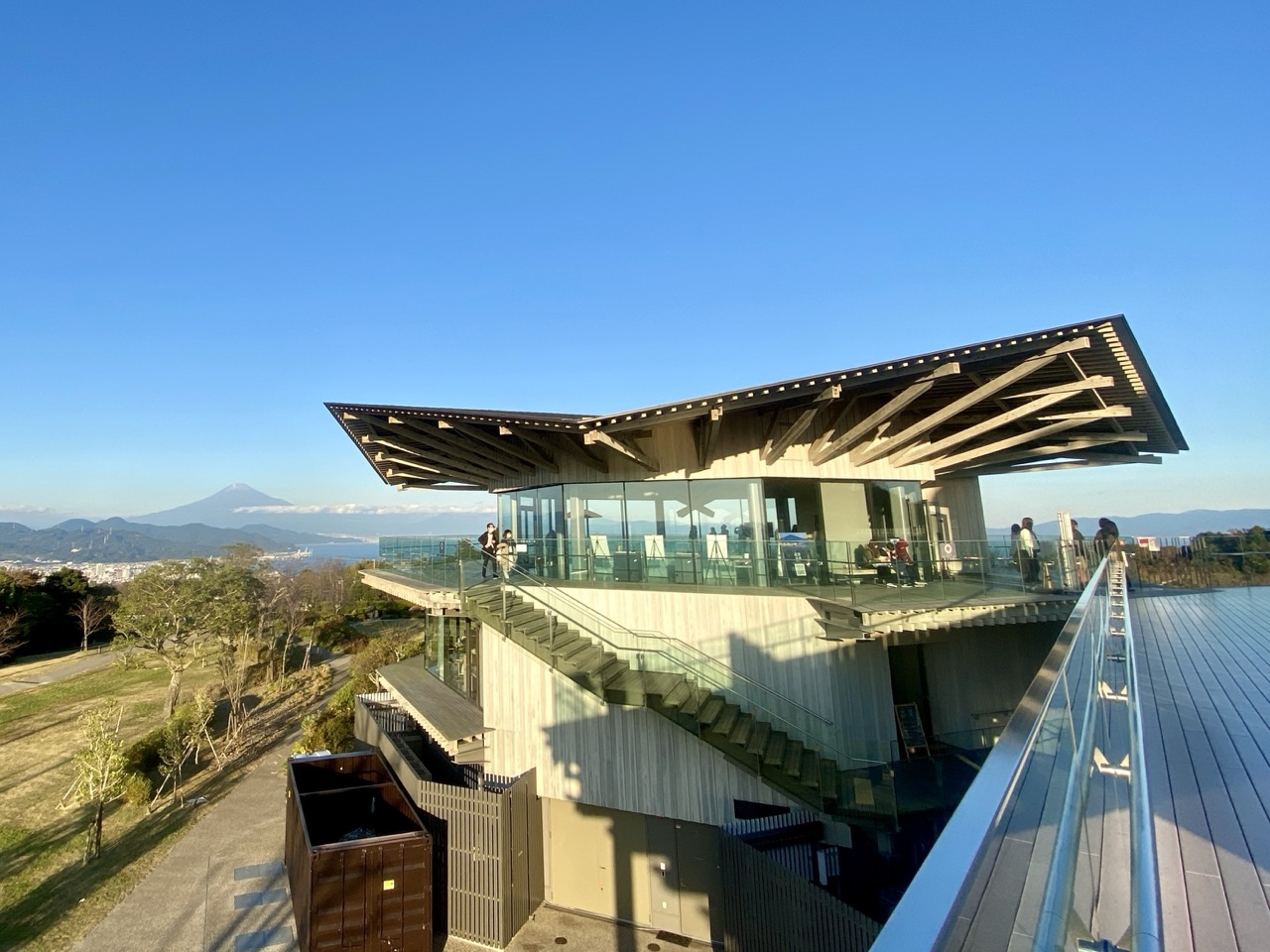 走上三楼设置在户外的展望回廊,从这里看出去的风景,能看到世界文化遗产富士山与三保松原、骏河湾、静冈市区。天气晴朗,还能远眺伊豆半岛和南阿尔卑斯山脉。