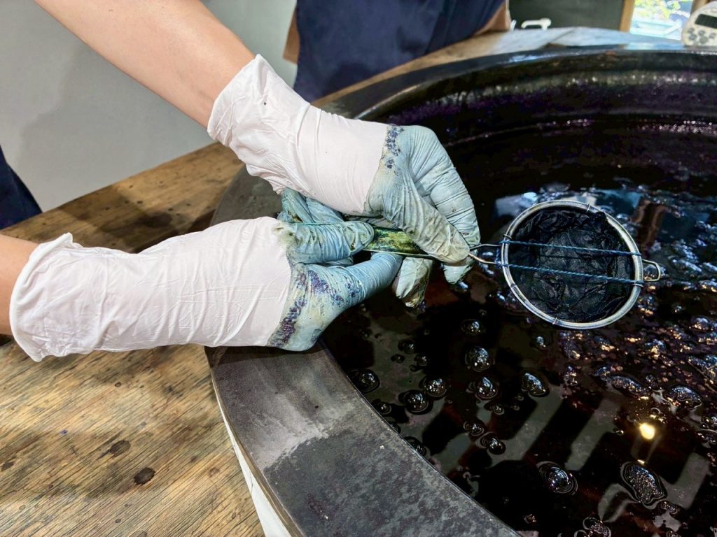 听完职人的解说后,再实际自己手作,一边将手帕放入染缸,一边期待着完成品。职人说,染出来的花色,其实也会反应出自己的个性,感觉好有趣!
