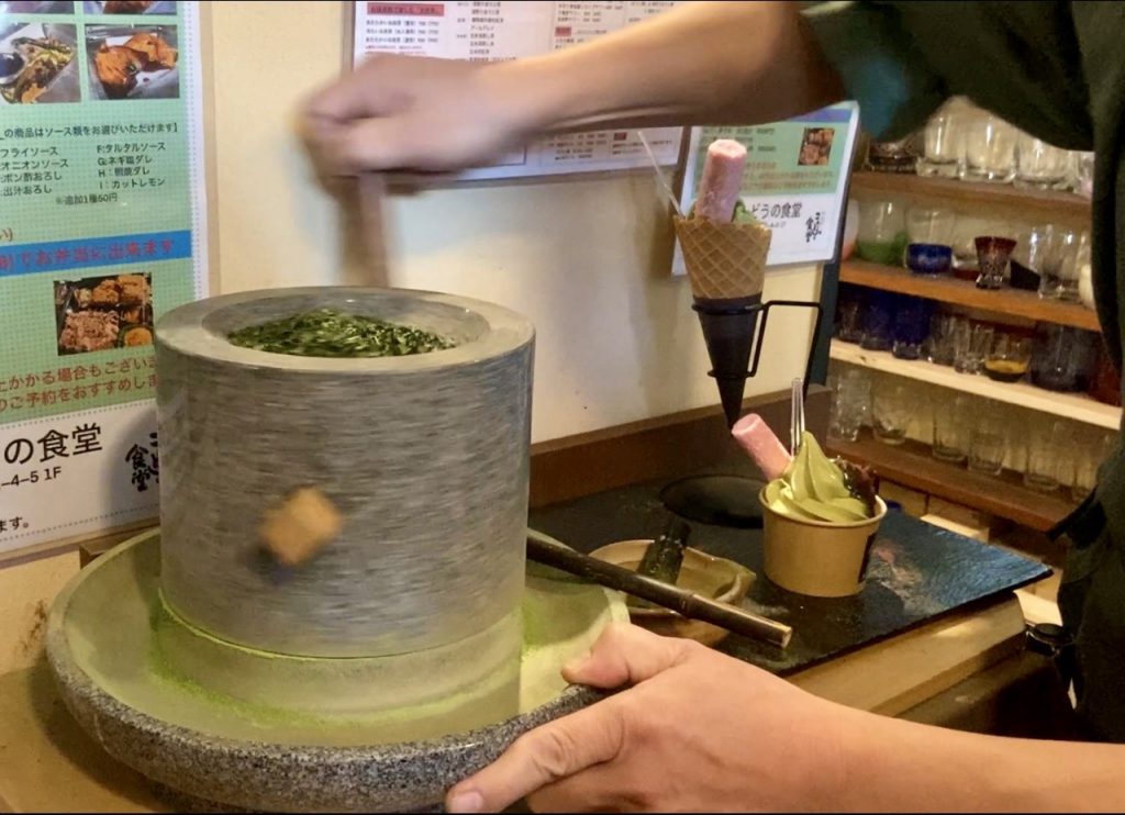 另外还加点了抹茶霜淇淋(お抹茶ソフト),动态的视觉无法被清晰的保留在相片里,却可以感觉到老板对茶的热爱!点缀在抹茶冰淇淋上的,是老板现磨的抹茶,甜度适中、茶香浓郁的抹茶霜淇淋,是完美的餐后甜点。