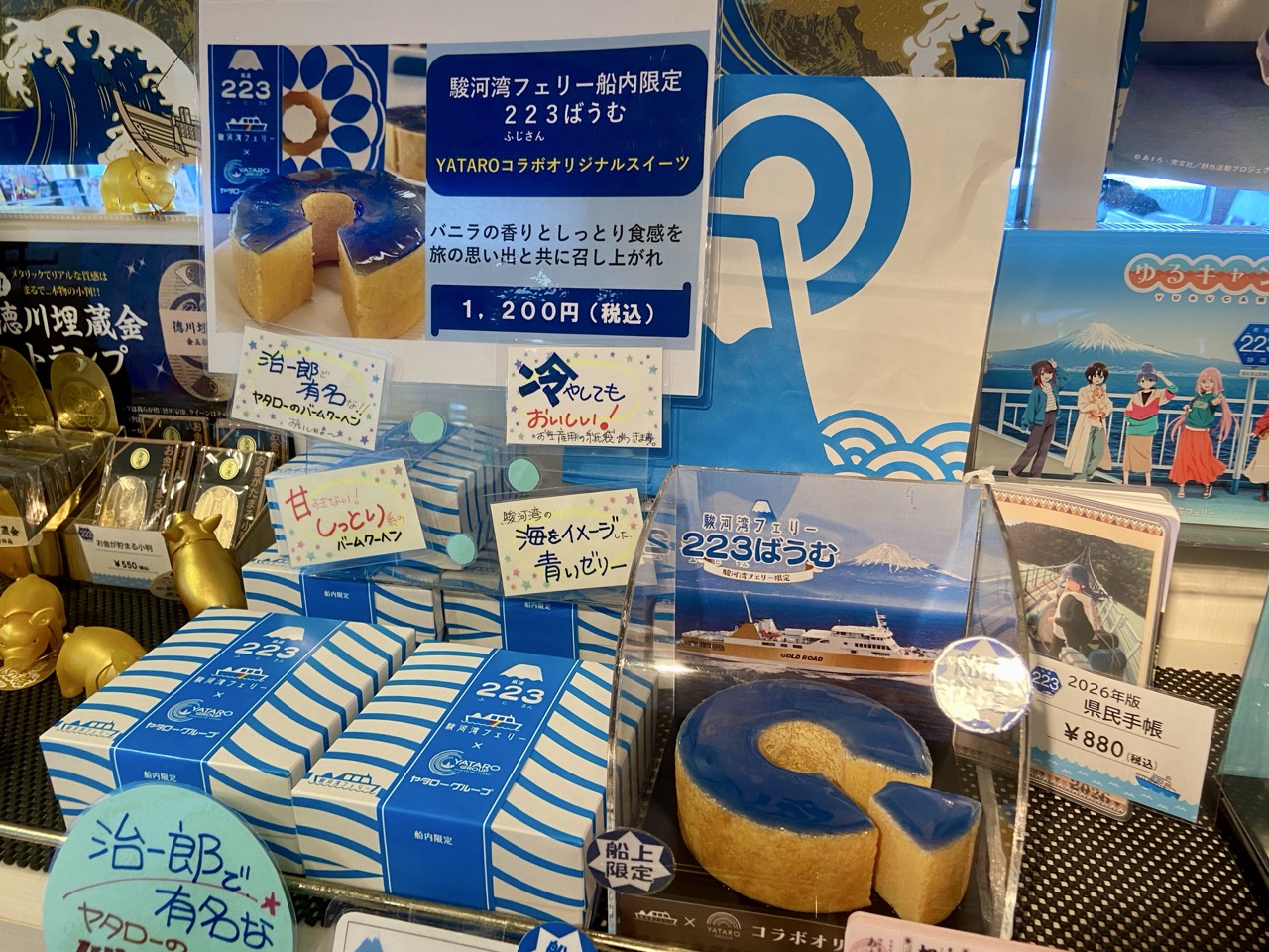 船内有小咖啡厅,贩售各种限定纪念品、限定贩卖土产,晕船药等等。被称为日本三大年轮蛋糕名店「治一郎」合作限定的「223 年轮蛋糕(223ばうむ)」、静冈的抹茶义式冰淇淋名店合作限定发售的「骏河湾义式冰淇淋 No223(駿河湾ジェラートNo223)」,以骏河湾的海为印象的蓝色,都来自天然健康的蝶豆!