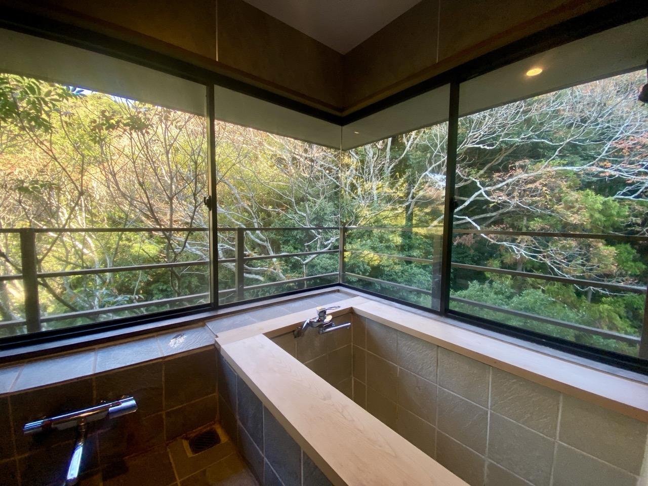 入住的客房特别选了附有私人露天浴池的房间,早上泡汤还可以一边欣赏庭园美景,一边享受温泉。