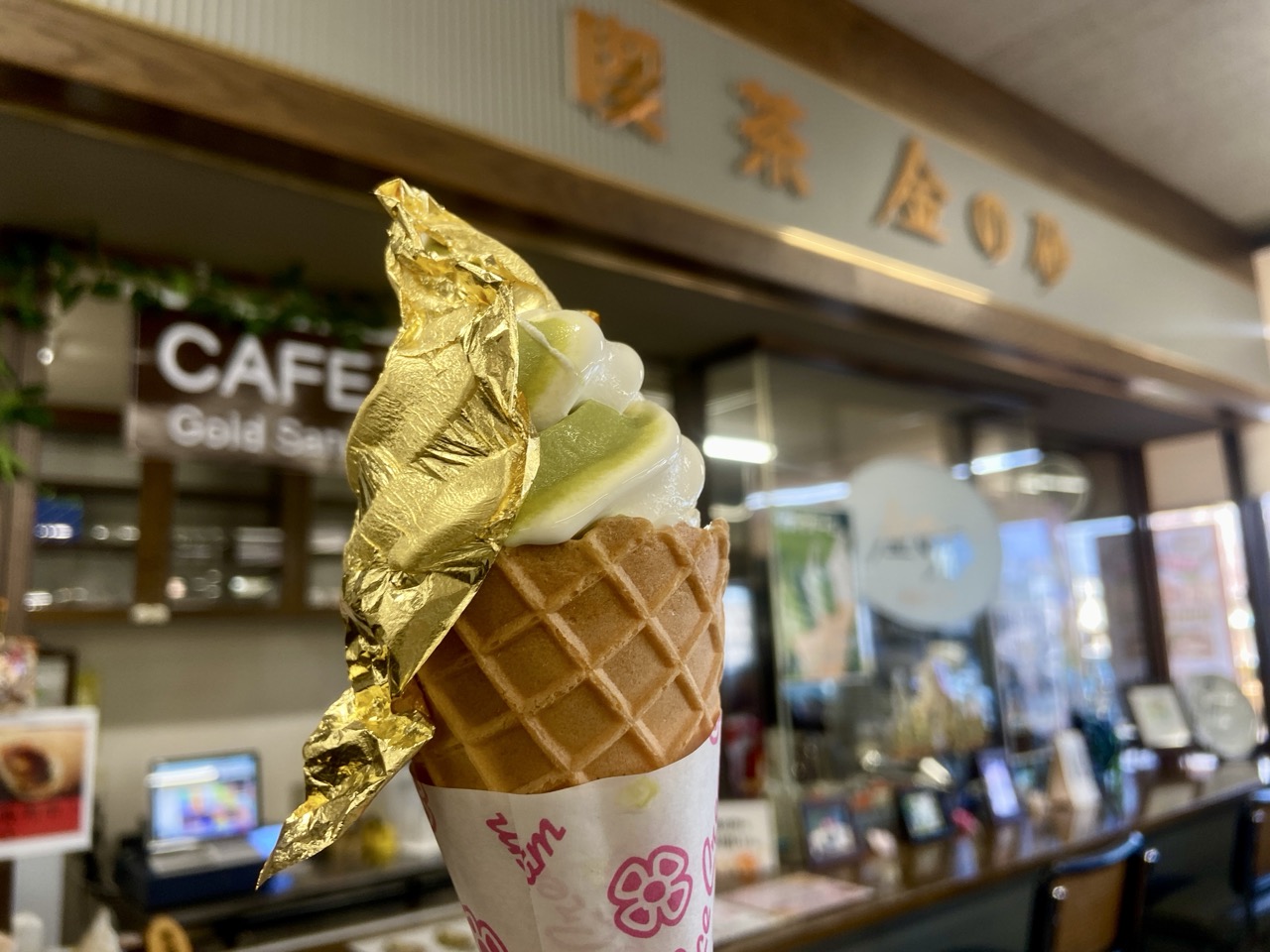 「土肥金山」最后的亮点,超级视觉系甜点「金箔冰淇淋(金箔ソフト)」!浓郁的香草+抹茶口味的冰淇淋上,豪迈地贴着一大片闪耀的金箔。没有淘到沙金也别气馁,我们可以将一整片金箔财气吃进肚子里!