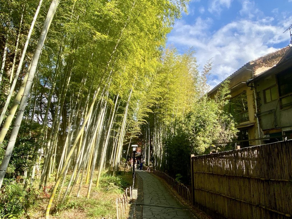 漫步于被誉为「小京都」的修善寺一路前往修禅寺,途中经过的幽静竹林小径让人感到平静,中途有个竹制的平台,可稍做休息,躺在上面往天空看,抬头是光线穿过竹叶的点点日光。让人在红叶的热情中,找到一丝清幽的禅意。