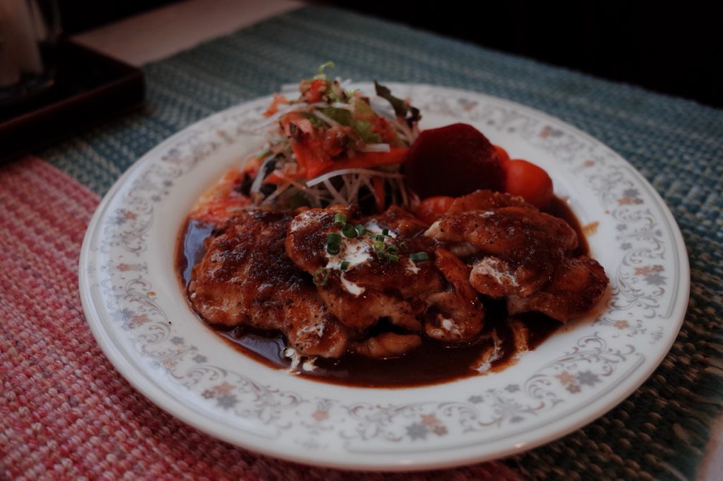 遊び庵提供鸡肉套餐,并有番茄与姜汁口味可以选择,鲜嫩多汁的鸡肉与老板的特调酱汁,配上白饭真的是绝佳组合。如果不赶时间,不妨选个窗边座位,一边品尝料理、一边细细品味角馆风情吧!