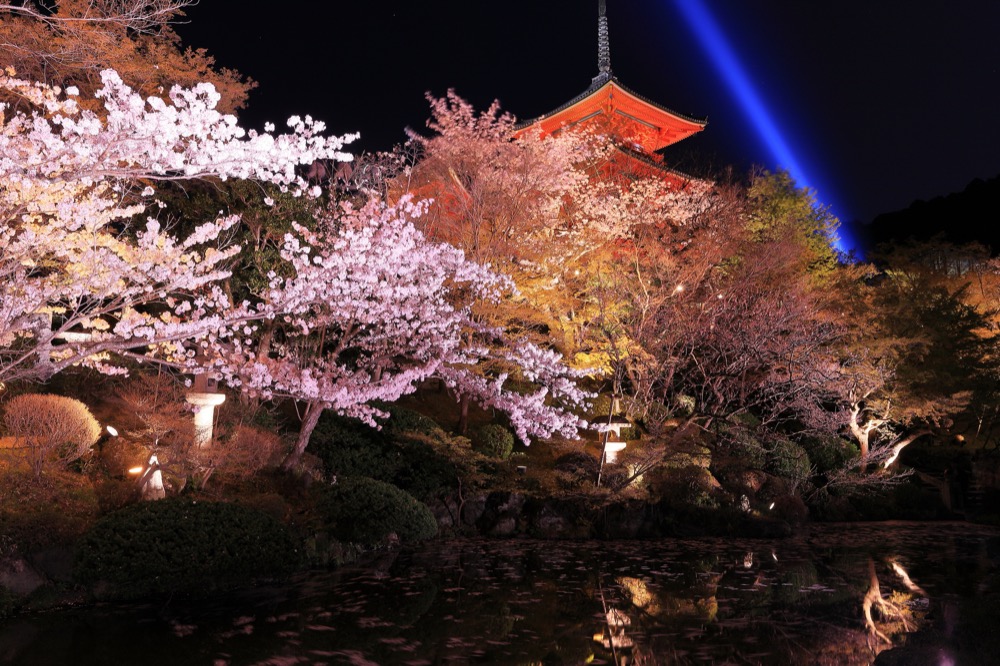 特别推荐的是限定举办的夜间特别参拜,将有机会欣赏到平时难得一见的清水寺夜樱。当樱花在夜幕下被灯光点亮,与古老建筑共同营造出梦幻的画面,让清水寺在夜晚散发神秘迷人的氛围。