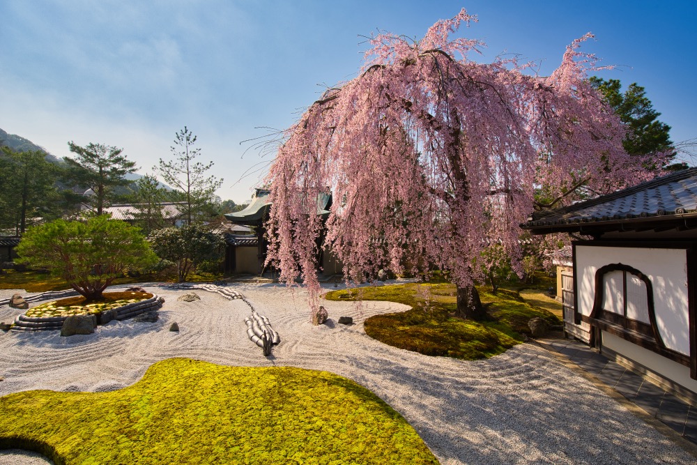 「高台寺」以著名的莳绘工艺闻名,是由丰臣秀吉的正室北政所(又称宁宁),为了纪念亡夫而兴建。自江户时代以来,一直以其美丽的花景闻名,不仅在秋季展现红叶之美,同时也是赏樱的绝佳胜地。