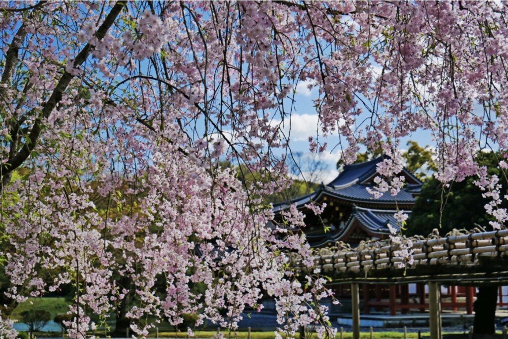 京都的赏樱胜地之一「平等院」,建于 1053 年的平安时代后期,被誉为世界遗产,以其优美的「凤凰堂」和春日樱花、秋日枫叶的美景,深受世界各地的旅人喜爱。每年的 3 月下旬至 4 月上旬,凤凰堂倒映在如镜的「阿字池」中,与绽放的枝垂樱、染井吉野樱和山樱交相辉映,呈现出令人屏息的绝景。