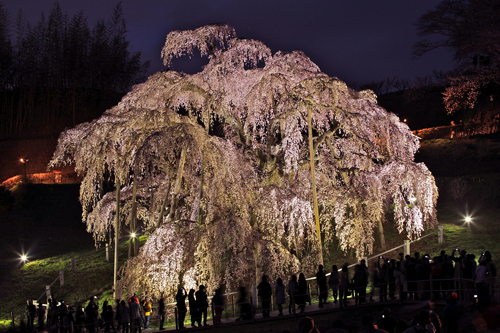 三春泷樱花的树龄据说已超过1000年,是日本三大樱花树之一。树高13.5公尺,根围11.3公尺,枝干东西长25公尺,南北长20公尺。樱花盛开时开满淡红色的小花,远观像瀑布,所以称为「泷樱」(瀑布樱)。