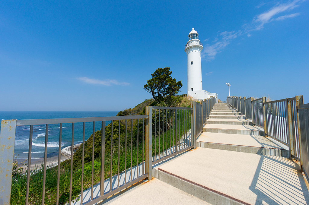 这座白色灯塔矗立在臼矶海岸海拔73公尺的悬崖上,建于1899年。日本仅有十六座可攀登的灯塔,盐屋埼灯台是其中之一。