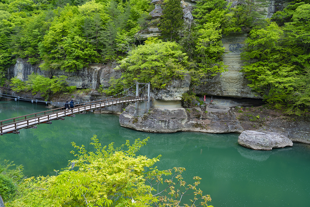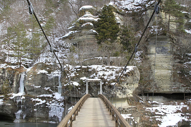 石头有各自的名称,像是屏风岩、象塔岩、狮子塔岩等。夏天可以欣赏紫藤花,秋天则是红叶,景色迷人。走过吊桥,更能近距离观赏悬崖,从吊桥上俯瞰景色也令人难忘。附近有餐厅和纪念品店。