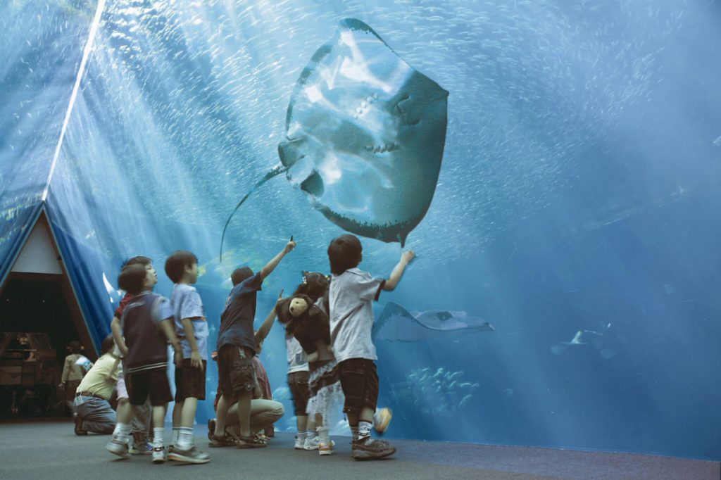 最受瞩目的是这里拥有世界第一座采用三角隧道的大水槽「潮目之海」,当你走在黑潮与亲潮的交界处时,能近距离观察栖息在这一区域的鱼类。馆内设有餐厅、寿司店等,而馆外则设置有人工海滩及「WAKUWAKU里山和绳文之乡」。