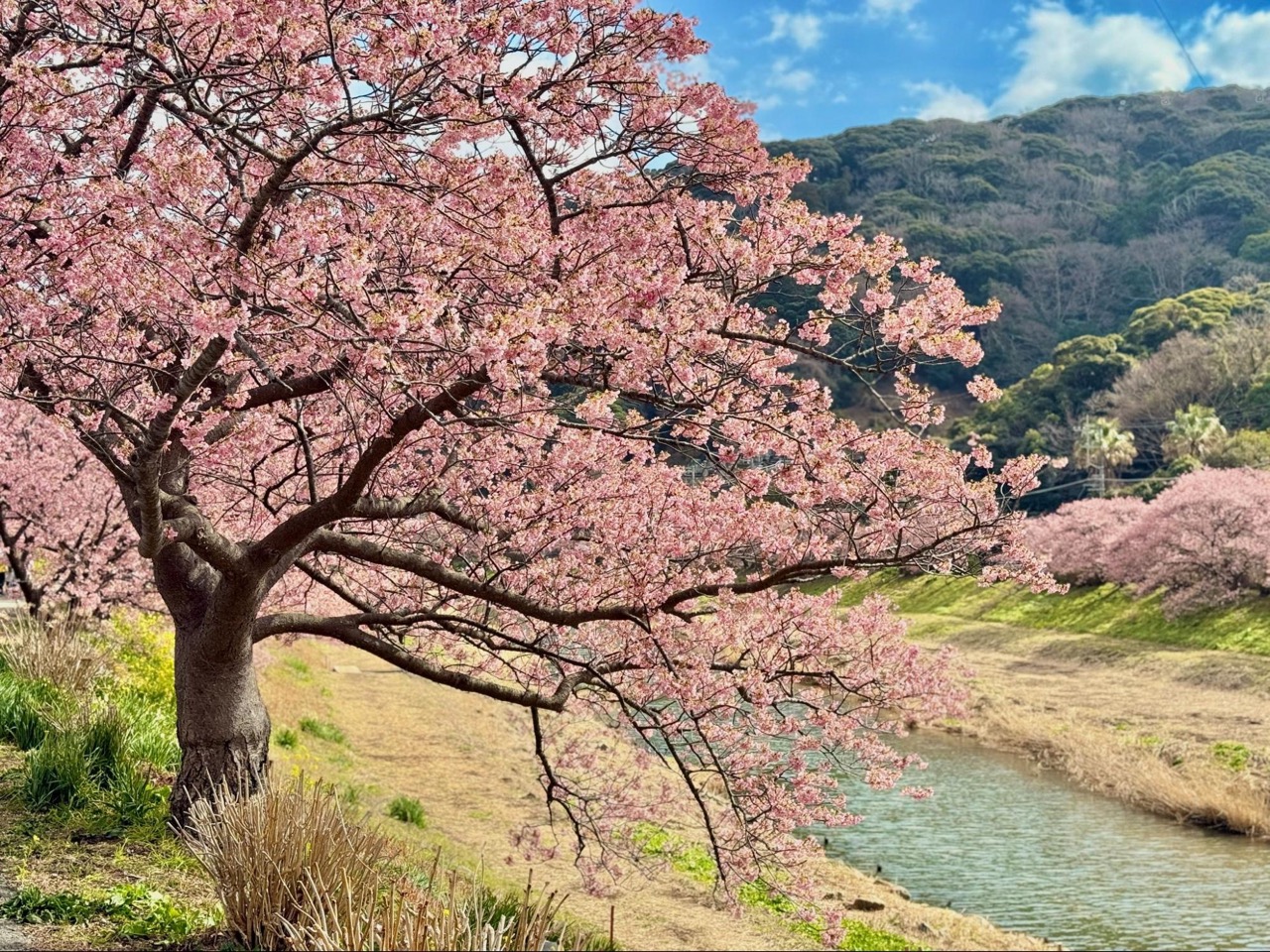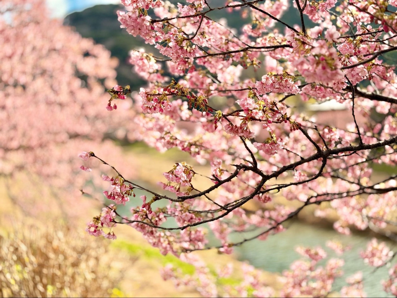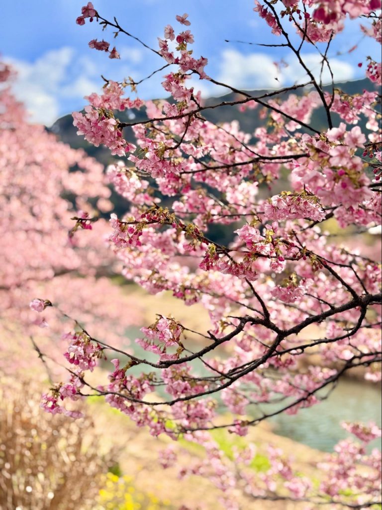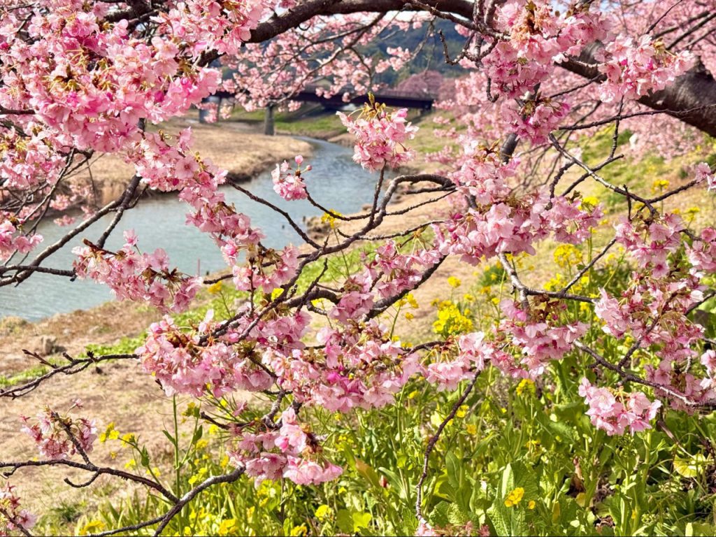 河岸旁的油菜花与河津樱同时盛开,大片金黄色铺展在柔美樱花之下,形成南伊豆特有的春日景观。粉红与金黄交织的画面,不需要刻意构图,自然就成为令人难忘的绝景。