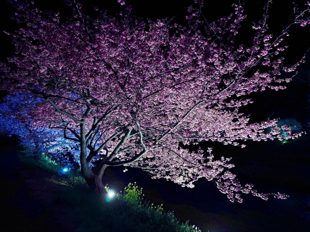 祭典期間特別設置的夜間點燈,為河岸櫻花披上一層溫暖光影。暖黃色燈光映照著河津櫻,花瓣的粉色轉為柔和沈穩的色調,枝幹與花朵的輪廓在夜色中清晰浮現,與白天明亮的花海形成截然不同的表情。