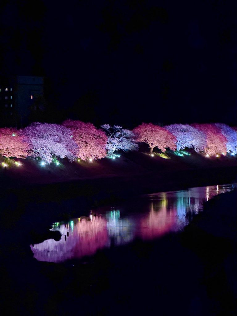 粉色花瓣沿着河岸绵延,在夜色中闪动柔和光影。灯光同时映照于河面,水波随着微风轻微晃动,樱花的倒影也随之流转。