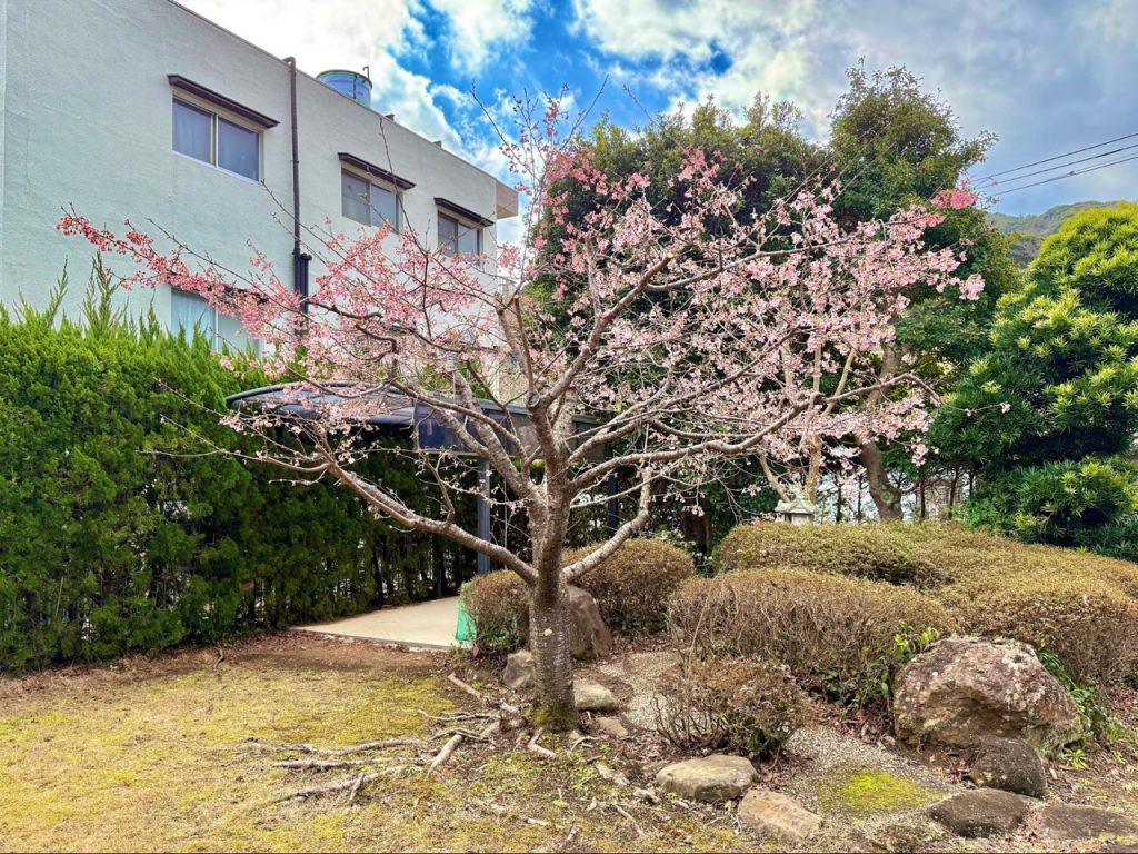 门前有庭院,院子里种着几株樱花树,虽然尚未完全绽放,让人不禁想像满开的模样。届时,或许连庭院都会染上一层粉色。