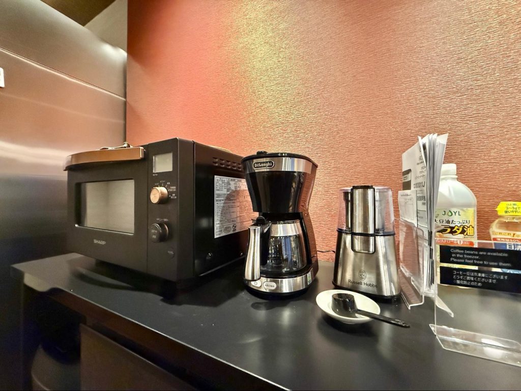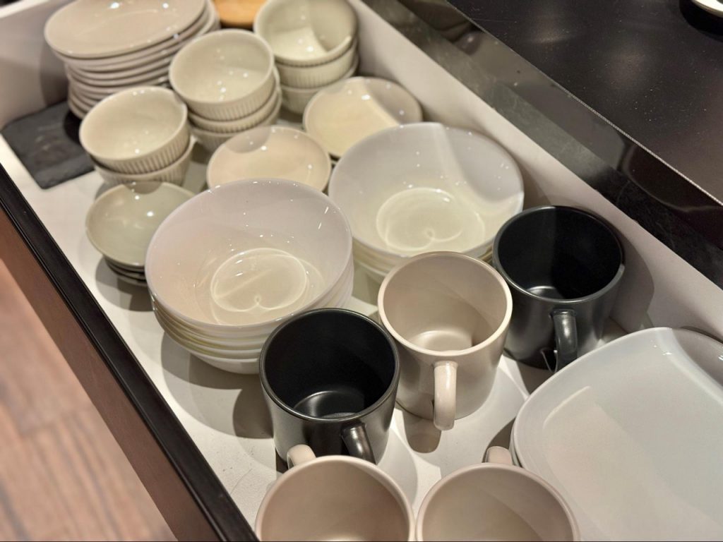 当晚看完夜樱,特地前往附近超市采买食材。厨房内备有齐全的锅具、刀具与高质感餐具,基本调味料也一应具全,从烹饪到摆盘都不需额外准备。流理台宽敞且设备完善,使用起来毫不局促。能在旅途中亲自下厨,将在地食材端上餐桌,是另一种贴近地方的方式。