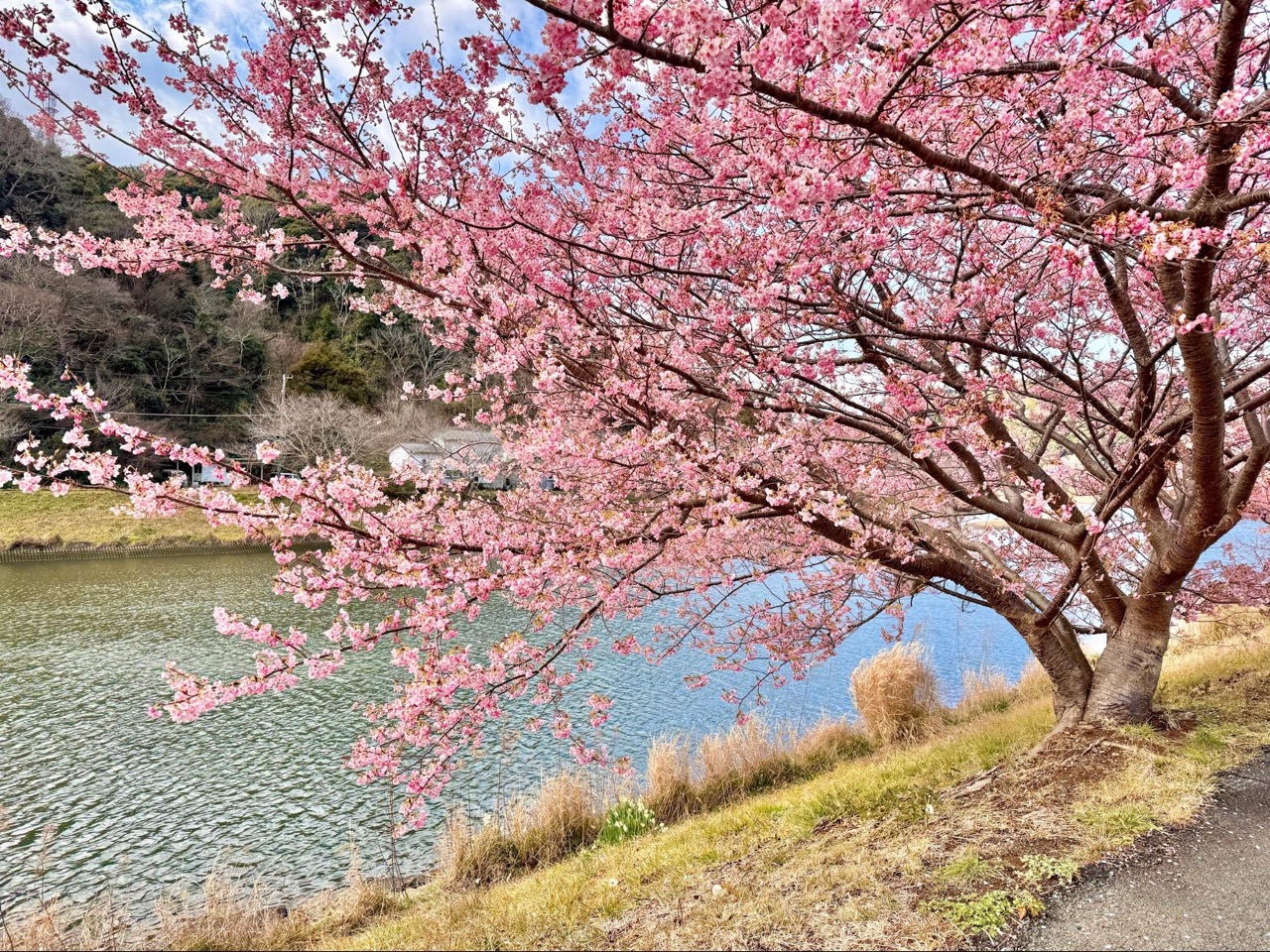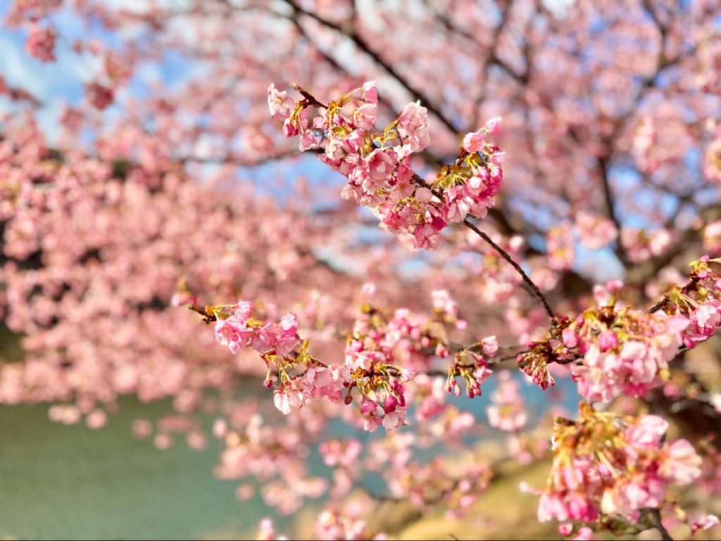 夜樱沉稳浪漫,而白昼阳光落在河津樱的花瓣上,粉色更为轻盈透明。河川水面映着蓝天与花影,微风吹过时,树枝与花朵轻轻晃动,我也与整条河岸一起缓慢呼吸。