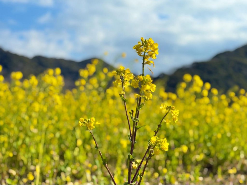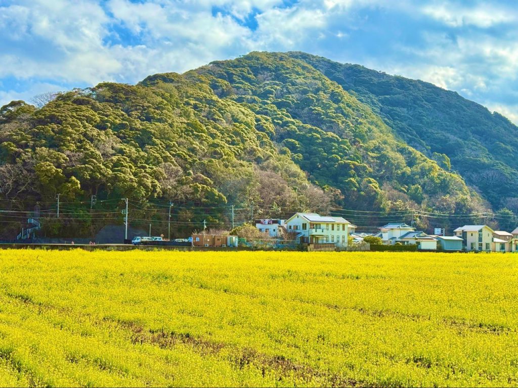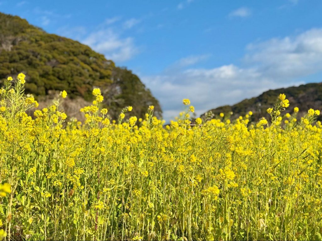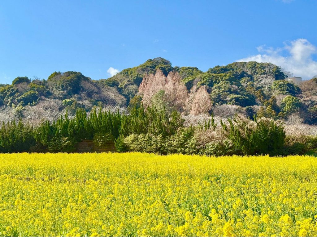 站在花田中央回望,远处樱花的粉色隐约浮现,黄与粉在同片地平线上交会,使南伊豆的春日更加鲜明。