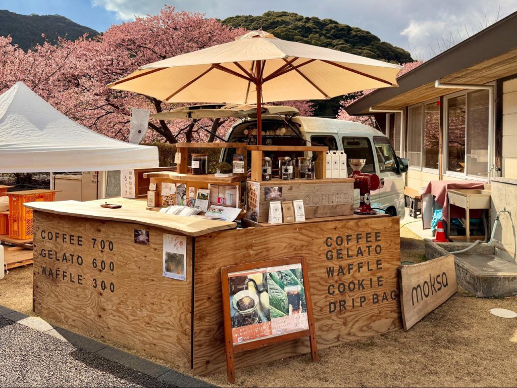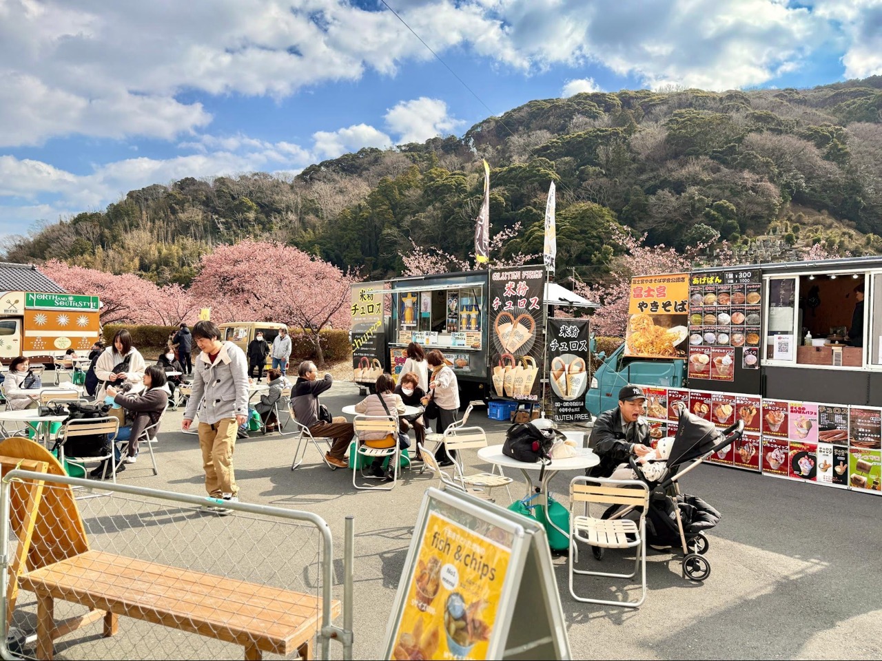 在「道之驿 下贺茂温泉 汤之花(道の駅 下賀茂温泉 湯の花)」,聚集了几辆餐车,似乎是因应樱花祭典而形成的小小市集。没有过度的布置,简单的车身与招牌,加上周围是整片盛开的春景,因而格外热闹。