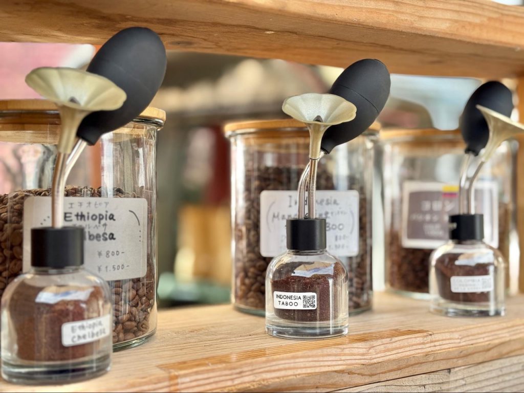 摊位摆放着数个像是气囊般可按压的装置,轻轻一挤,空气瞬间弥漫咖啡豆的香气,如同喷洒香水般细致,干净而厚实,让人先用嗅觉感受风味。