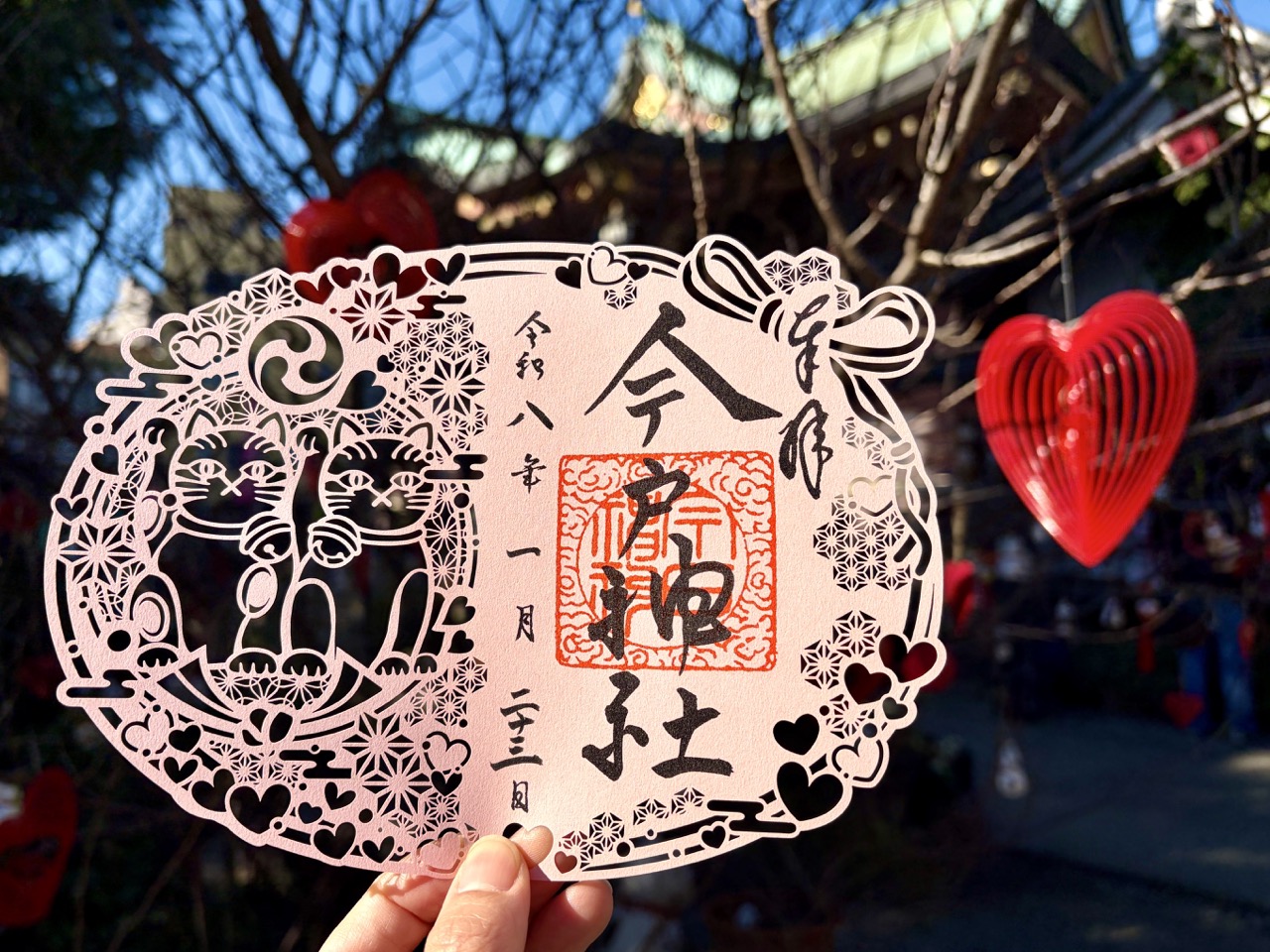 这款限定版御朱印,粉色纸张带着细致的珠光效果、剪纸样式结合了招财猫、爱心图样,非常可爱,深深掳获日本单身女性的心。因为是限量的限定款,想收集真的要看有没有缘份。但别担心,传闻日本经常有因为大受好评的关系,而追加贩售。收集御朱印的旅人,也可以追踪神社的 Instagram 喔!