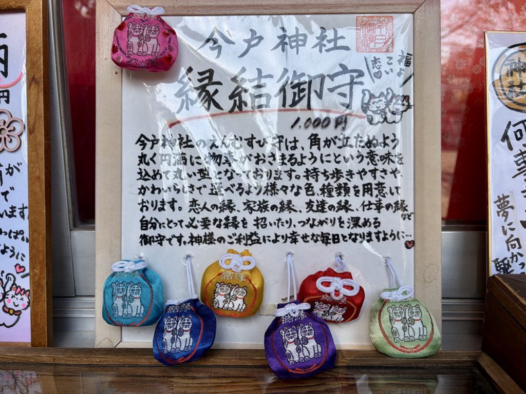 今户神社的「结缘御守(縁結御守)」种类繁多,之所以设计成圆形,是因为没有棱角的圆形,象征着万事圆满,而且「圆」和「缘」在日文中也是谐音,当中寄托了希望缔结良缘的愿望。