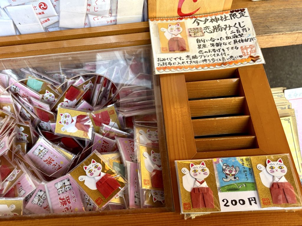 今户神社的签诗一共有四种,其中有放入了小巧可爱招财猫的「招唤幸福招财猫签(幸せを呼ぶ招き猫みくじ)」,还有被日本网友评价为准到不可思议的「恋胜签(恋勝みくじ)」。
