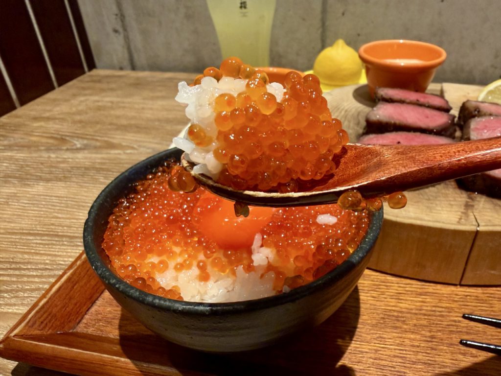 加价升级「鲑鱼卵卵黄饭(いくら卵黄ご飯)」,亮晶晶的鲑鱼卵与浓郁的蛋黄,拌入饱满的米饭中,咸香滋味与牛舌是绝配!