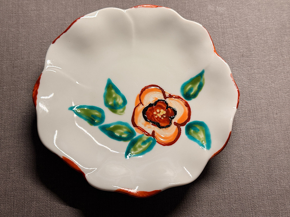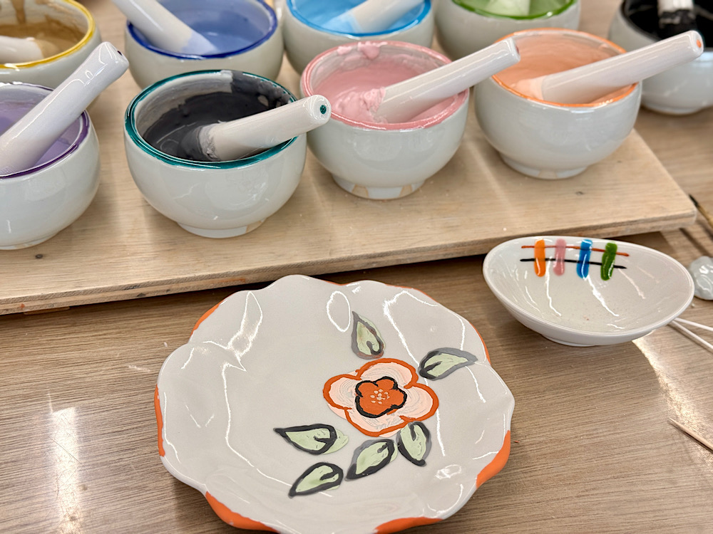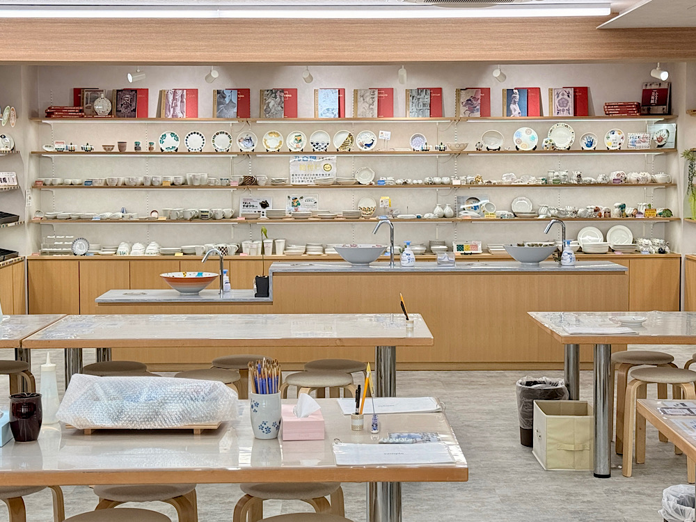 这里会提供已经烧制好的素坯,架上摆着各式各样的器皿可以自行挑选,有朴素实用的餐盘,也有造型特别的小碗与摆饰。选好器皿后,老师会先讲解九谷烧的颜色与画法。就算没有绘画经验,也可以慢慢完成属于自己的作品。