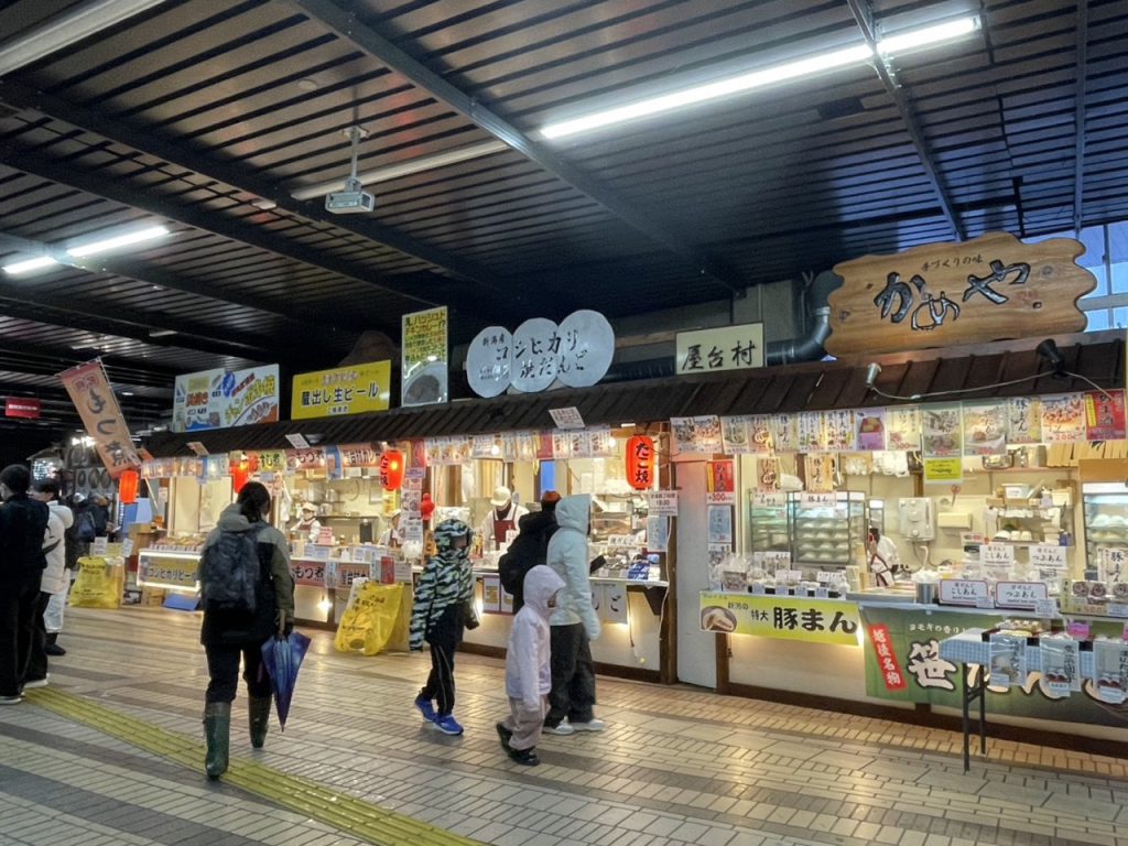 第一站要介绍的是车站内的「CoCoLo汤泽」!我们一到车站,就立刻被站内琳琅满目的小食店吸引住目光。这里不仅可以品尝到新潟名物「笹团子」,还有口感滑顺、以布海苔为特色的 「片木荞麦面(へぎそば)」,以及份量十足、馅料丰富的「爆弹饭团」。