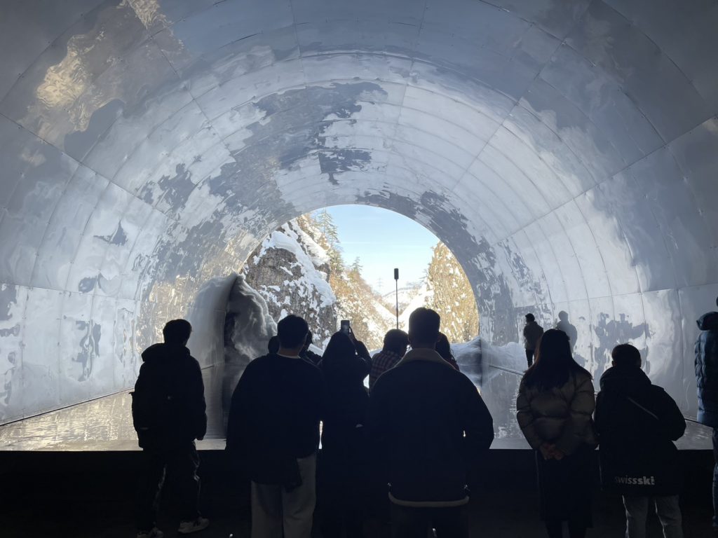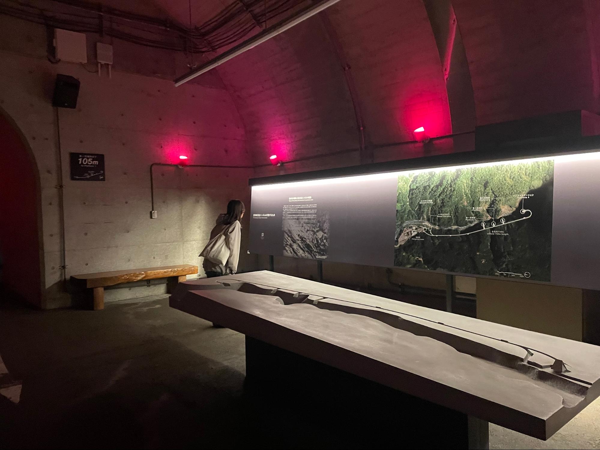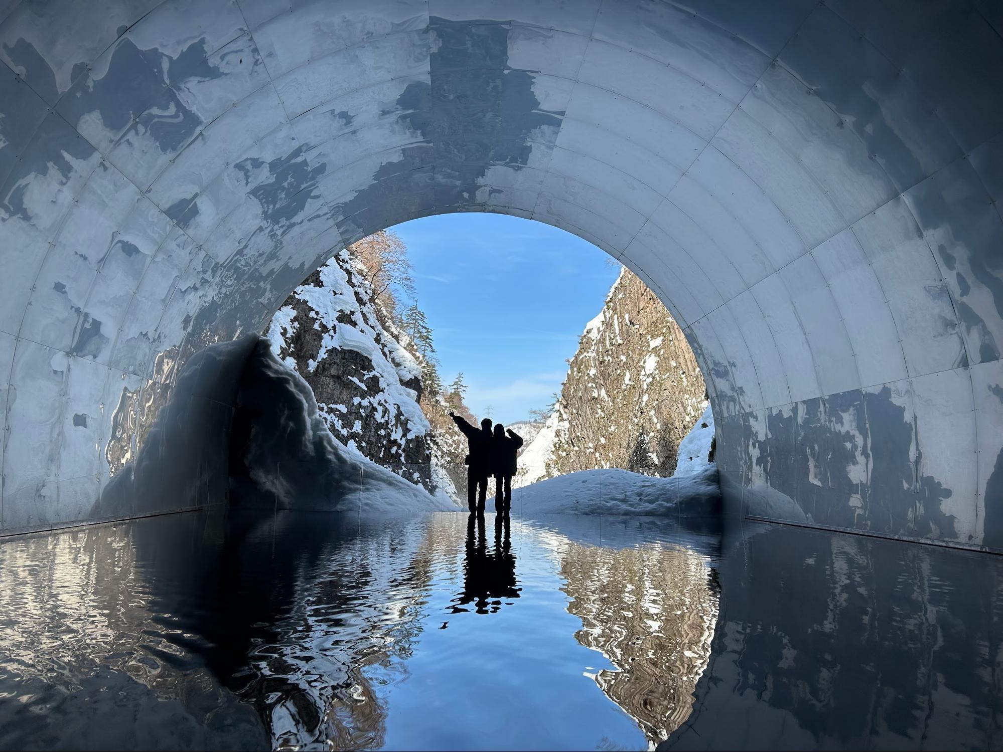 在清津峡的天空步道隧道内,除了可以安全地欣赏峡谷壮丽景色,最特别的是设置了艺术装置,透过光影、反射与空间设计,让旅人感受四季不同的峡谷风情。