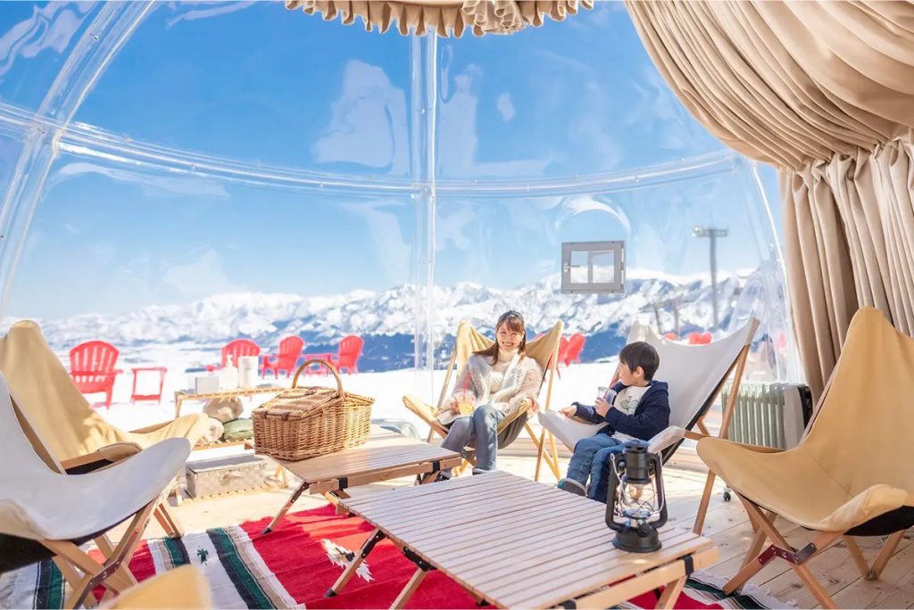 在石打丸山滑雪场的观光体验中,「圆顶帐篷(ドームテント)」是非常有趣的景点,适合不滑雪的旅人或想悠闲欣赏雪景的人。