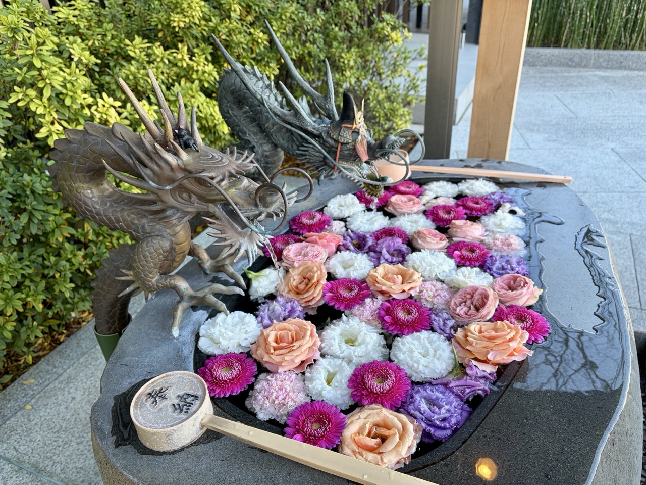 走上坡道不久后,来到了妙义神社的石鸟居前,记得先礼貌的敬礼。穿过鸟居拾级而上,左手边就是「花手水」,以双龙造型呈现,其中一条龙,头上还坐了一只黑猫,很可爱的小巧思。 神社境内除了参拜妙义神社的神明之外,还有渊源极深的「末社」以及祈求金运上升的「钱洗辨财天」。