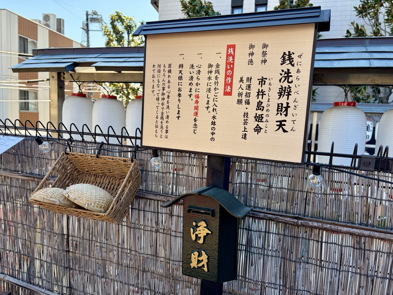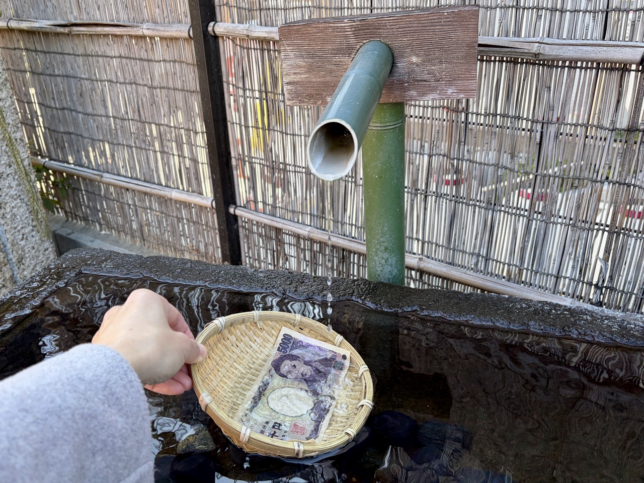 要如何祈求财运呢?首先将金钱放入竹篓中,浸入神圣的御神水清洗,同时心中默念祈求「福寿开运」,最后再向辨财天诚心参拜。
