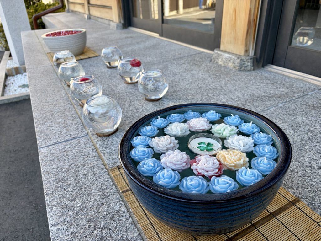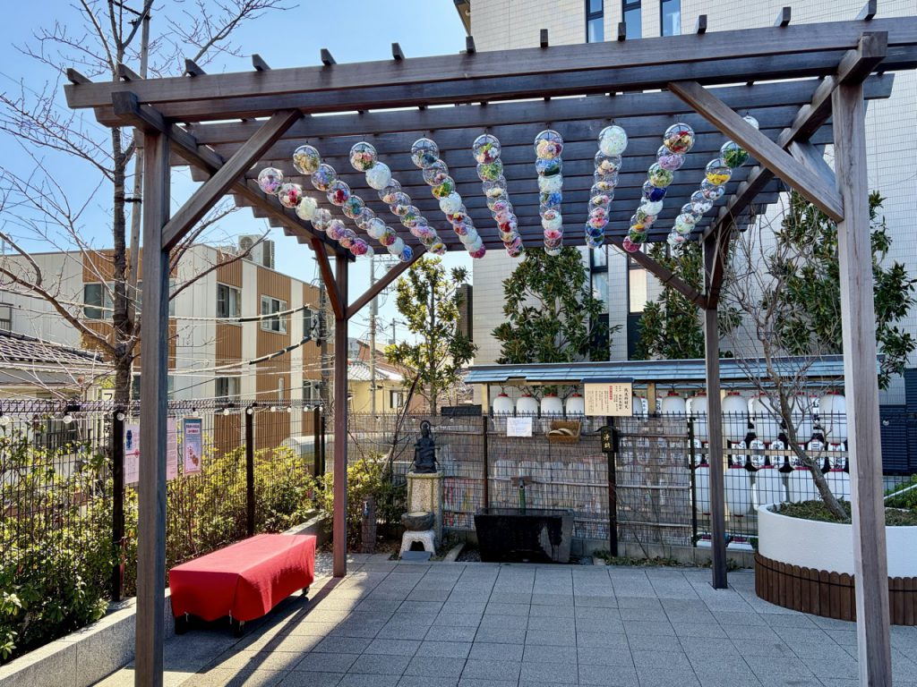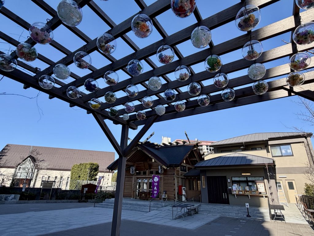 钱洗辨财天对面架设着风铃棚,这里不仅仅是精美的 Instagram 打卡地点,这些风铃自古以来便承载着驱邪避灾与祛除瘟疫的深意。这次造访,棚上装饰的,是许多圆形透明球,里面放入了各式各样的花卉,画面非常精致优美。