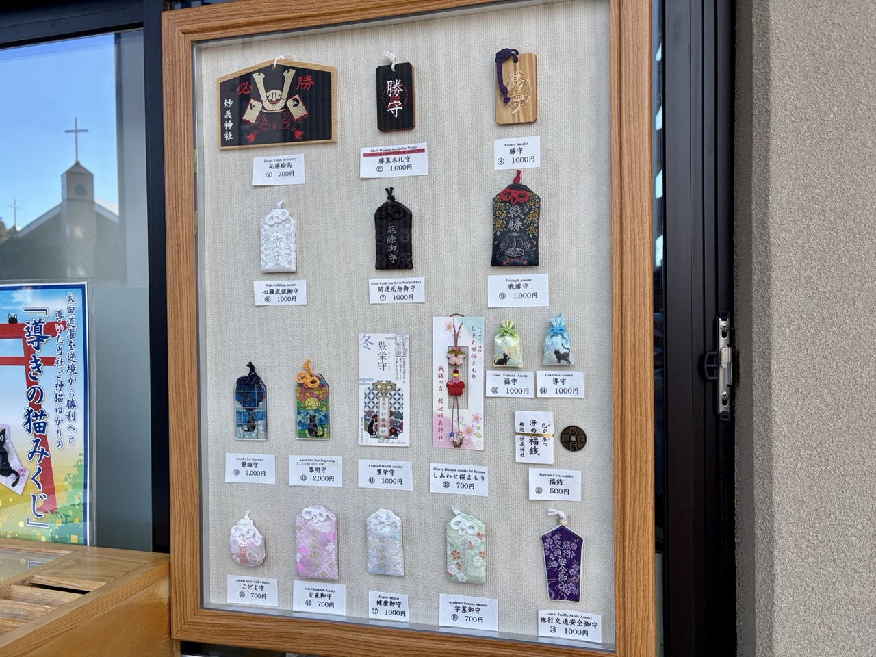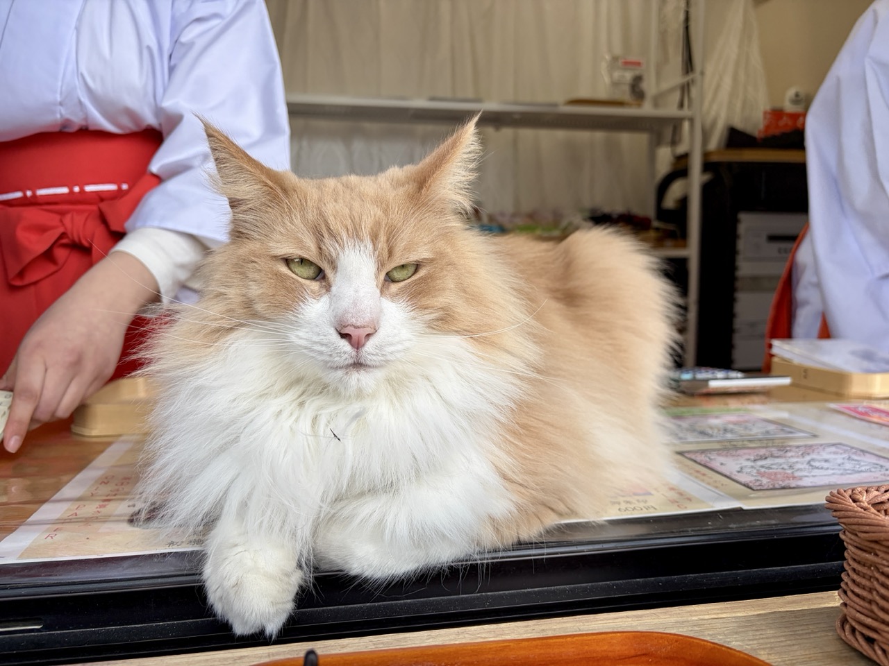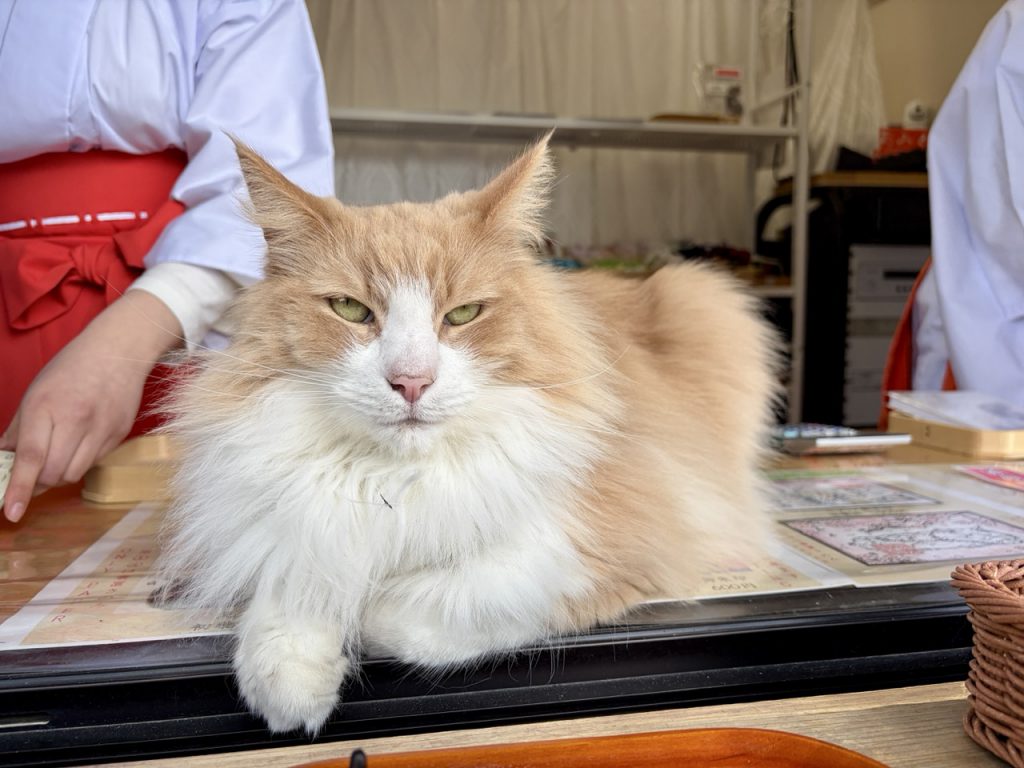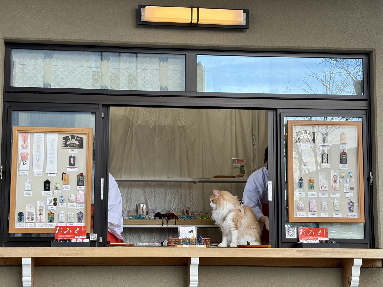 来到妙义神社,绝对不能错过境内的人气王:社猫「Mugi 君(むぎくん)」。到访时,正值神社社务所午休时段,下午一点整,两位巫女还没正式开始社务所的工作,Mugi 君已经以巨星姿态伫立在窗台,迫不及待和大家见面。
