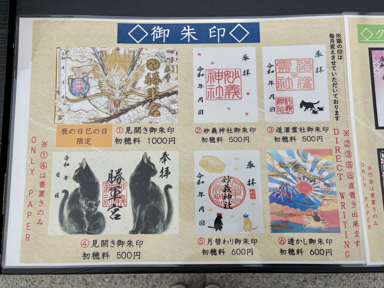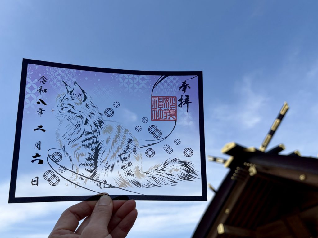 | 描图纸绘御朱印 | 由神职人员先在御朱印帐上亲笔书写(净书),再覆贴细致描图纸绘制图样,层次感极佳。图案每两个月更换一次,并融入神社象征「龙」与「黑猫」元素。 |
