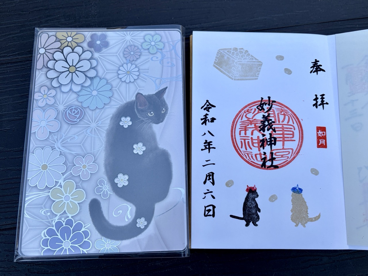 | 双页御朱印 | 横跨两面御朱印帐的华丽大作,以守护胜运的黑猫为视觉主角。 |