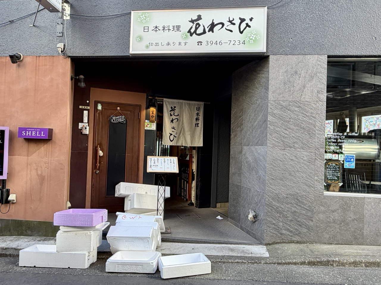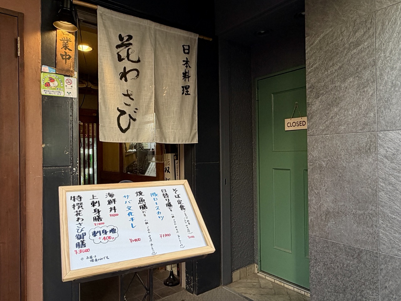 驹込站与妙义神社附近,藏着一间深受当地人喜爱的老牌日式料理店「花山葵(花わさび)」。这间店以新鲜渔获与诚意十足的定食闻名,是参拜行程中完美的午餐选择,开店时刻前,店门口还放着刚刚才到货的新鲜渔获保丽龙箱子。