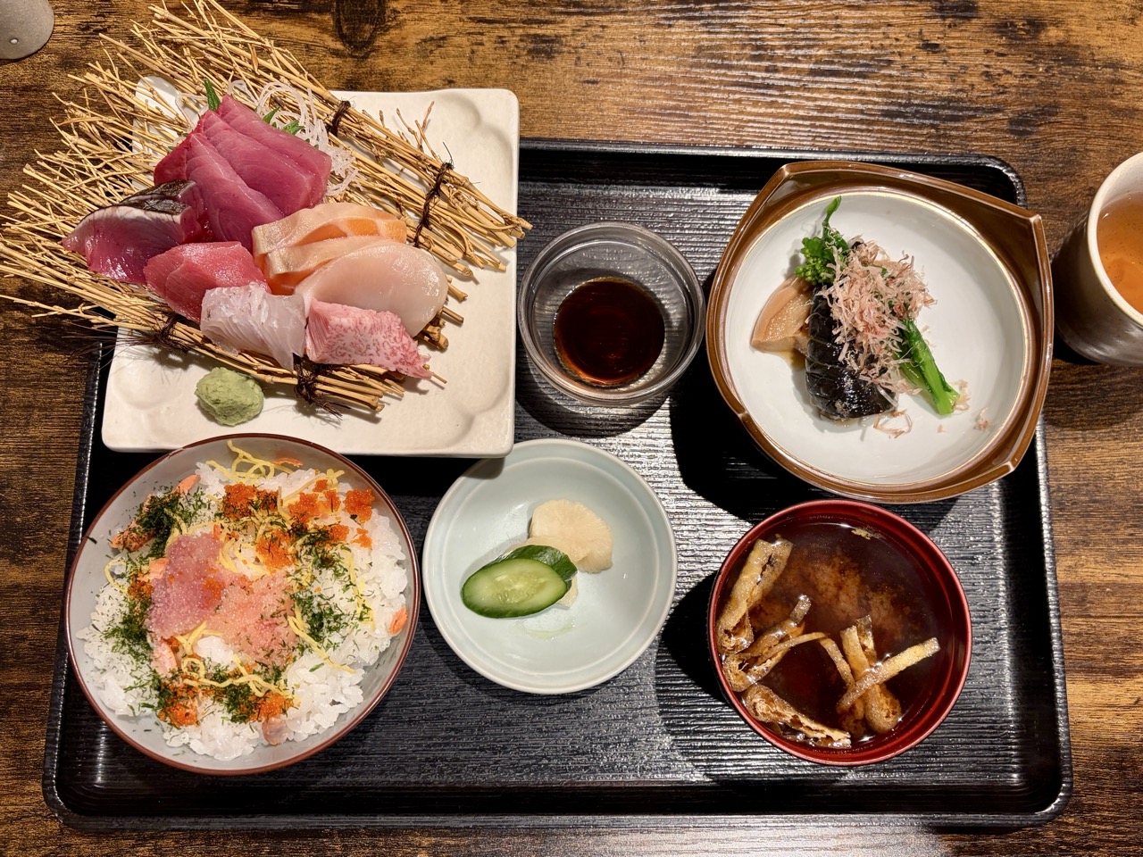 除了令人惊艳的主食生鱼片,定食还附上视觉满分的铺满鱼子与海苔粉的散寿司风味饭,随定食附上暖心的味噌汤,以及风味清雅的旬味小菜。