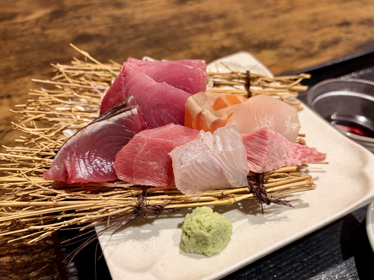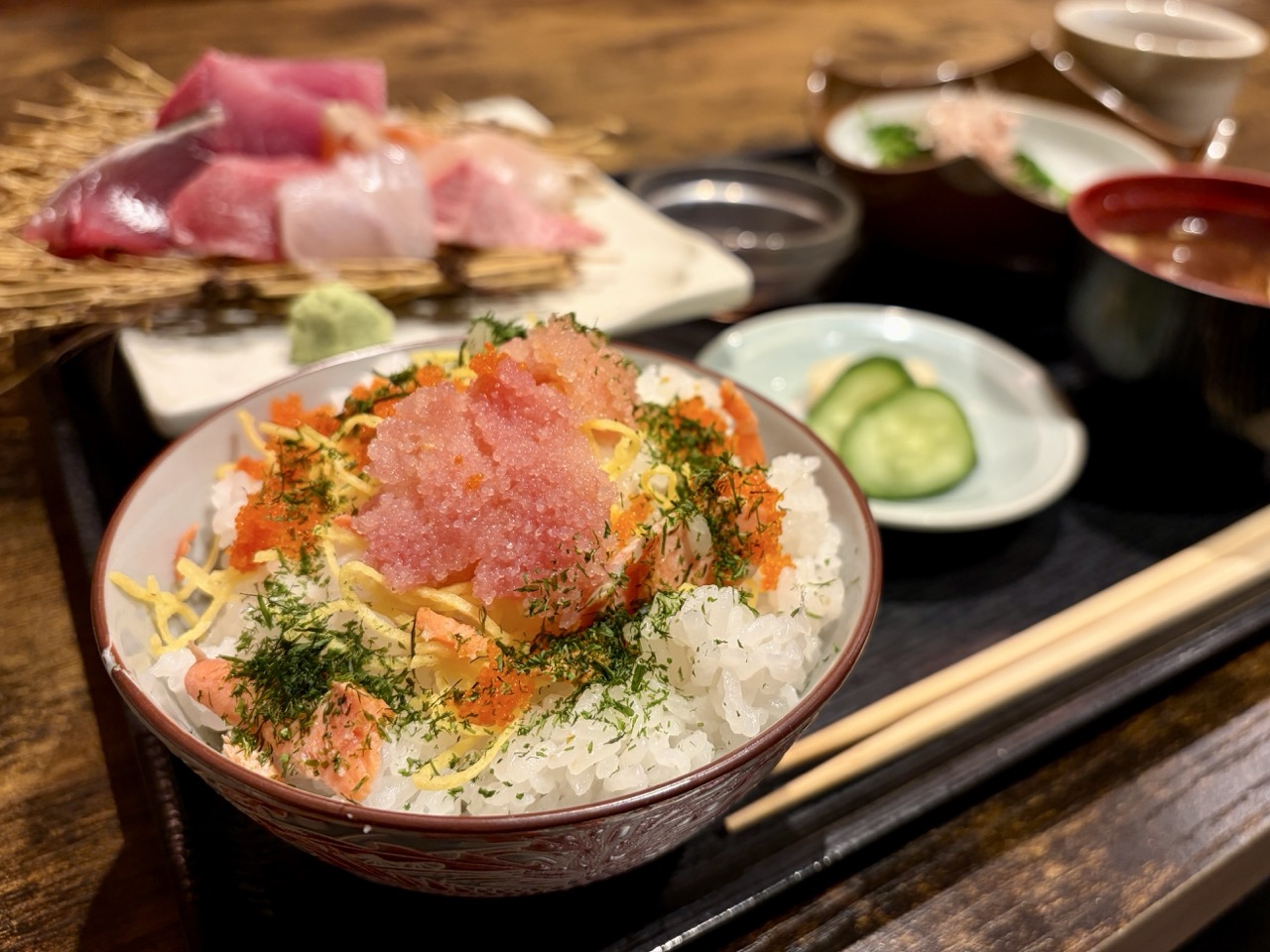 点了店内招牌的「上等生鱼片定食(上刺身膳)」,生鱼片拼盘有多种时令鲜鱼,从油润鲜甜的厚切鲑鱼、细致的白肉鱼到口感扎实的赤身鲔鱼,每一口都能品尝到海洋的精华。