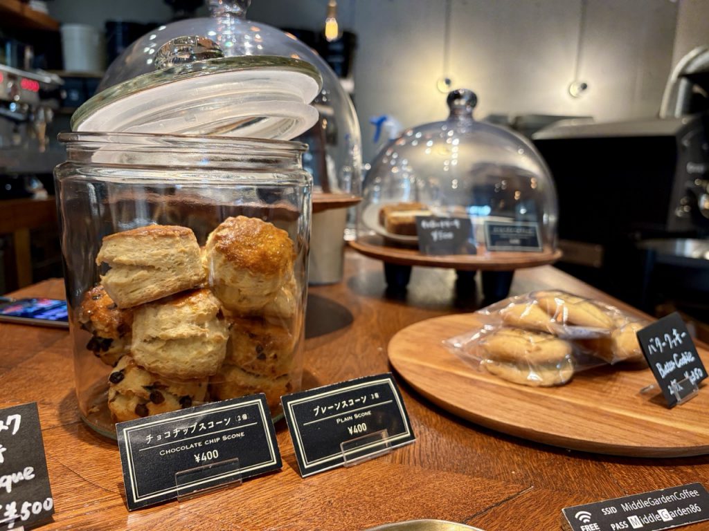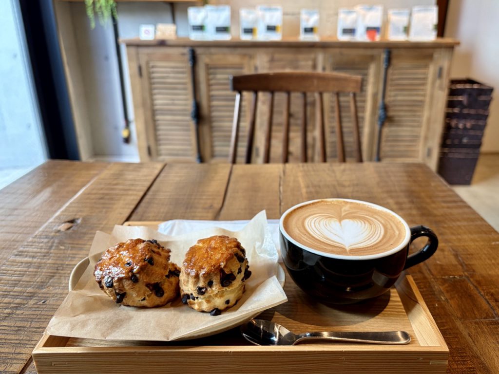 搭配一份外酥内软、布满浓郁巧克力的「巧克力豆司康(チョコチップスコーン)」,甜度适中且香气十足,是午后最知性的疗愈组合。