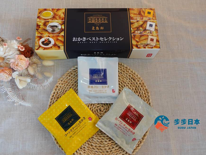 五岛轩是创业近 150 年的函馆老字号洋食餐厅,其中的各种咖哩更是五岛轩的招牌料理。北海道制果株式会社与五岛轩合作的精选综合米果,除了最人气的「 欧风咖哩米果(欧風カレーおかき)」,还有「玉米浓汤米果(コーンポタージュおかき)」「红酒炖牛肉米果(ビーフシチューおかき)」,一次满足三种口味!