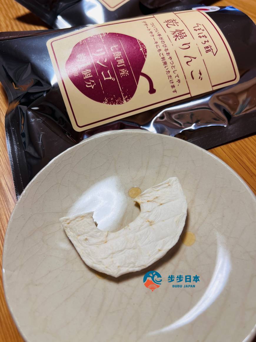 POPORO 馆(ぽぽろ館)位于距离函馆车程约 30 分钟的七饭町。「干燥苹果干(乾燥リンゴ)」使用七饭产苹果,经过 8~10 小时细心低温干燥制成。每一包约使用一颗苹果制成,无任何添加物及防腐剂,大人小孩都能安心享用!除了可直接当零食吃以外,也可加入优格,或者以清水泡软后,加入柠檬汁或兰姆酒,再用于制作松饼、蛋糕等甜点,多种用途,CP 值超高!
