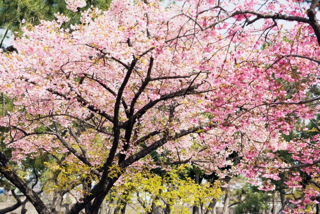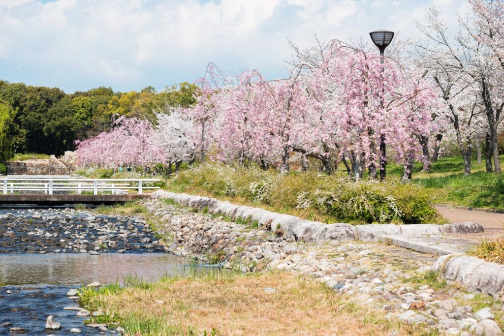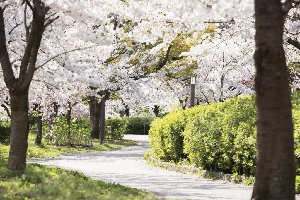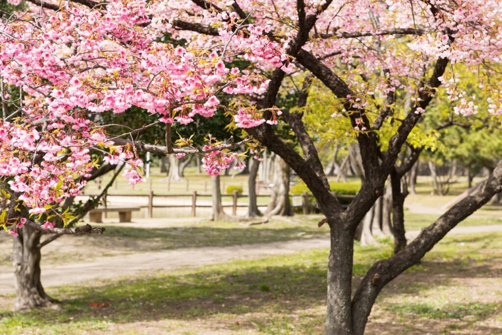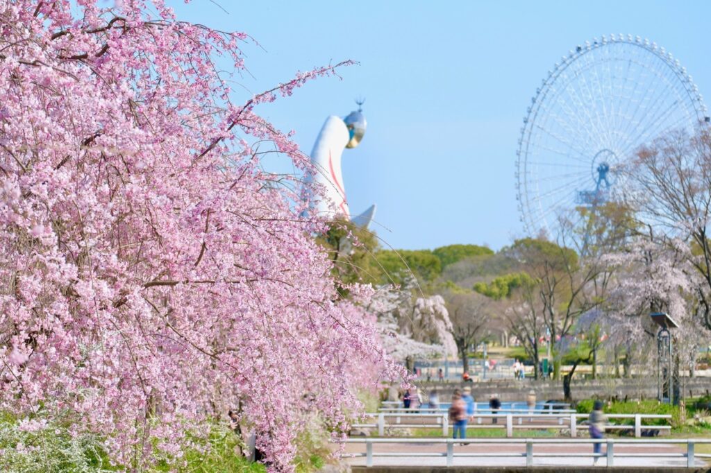 「花博纪念公园鹤见绿地」园内设有玫瑰园、杏仁树林等多种不同类型的植物景区。樱花从 2 月开始,便可欣赏到率先盛开的河津樱,随后至 3 月下旬的染井吉野樱登场,随着季节更迭,园内的樱花景致不断变换,得以长时间享受赏花的乐趣。
