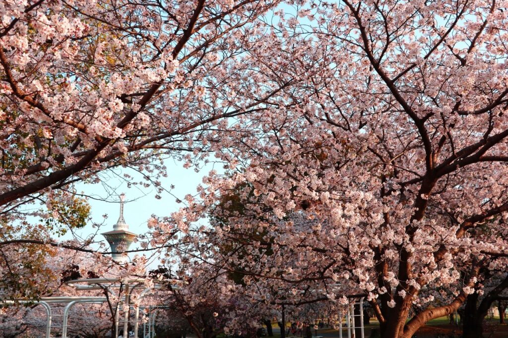 每年 3 月中旬起,园内种植的 12 种、约 5,500 棵樱花树依序盛开,彼岸樱、寒绯樱、染井吉野樱等各式品种次第绽放,将整座公园染成一片迷人的粉红色。