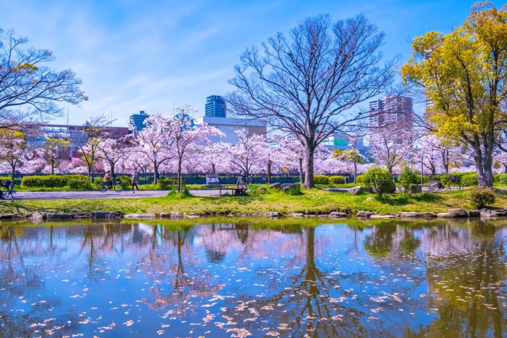 「大阪城公园」以大阪城为核心,绿意盎然,是都市中难得的绿洲,同时也是关西地区有名的赏樱胜地,园内种植了多达约 3,000 棵樱花树,每年春天都会吸引大批赏花的海外和日本游客慕名而来。大阪府的「樱花基准树(桜の標準木)」亦坐落于园区之内,每年便是依据这棵树的开花状况,正式宣布大阪的樱花季到来。