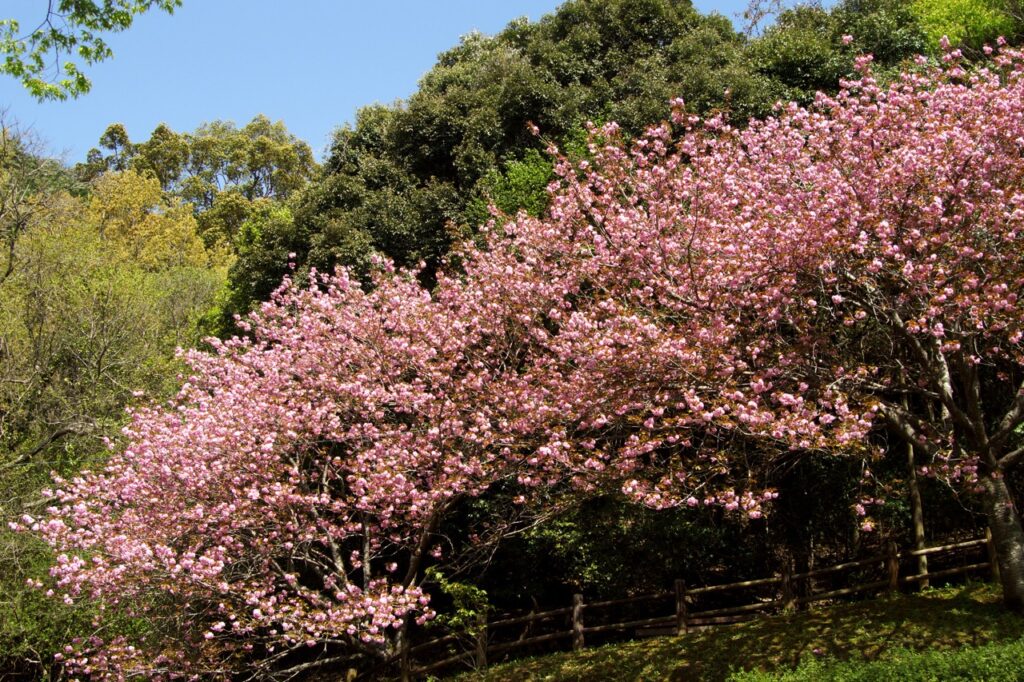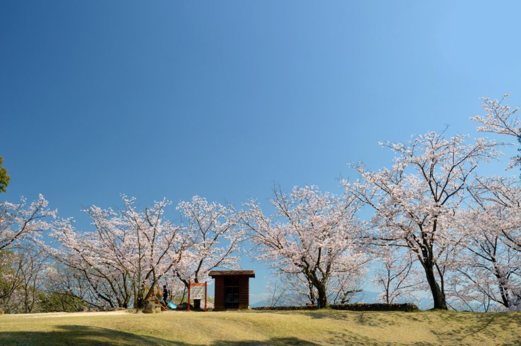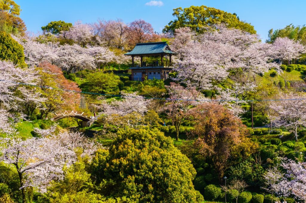 位于熊本县北部的「菊池公园」,拥有超过 3,000 株樱花树,是熊本著名的人气赏樱胜地。由于公园坐落于山丘上,种植了多种樱花品种,如染井吉野樱、山樱、垂枝樱等,每逢春季,不同深浅的粉色将山坡染得十分美丽。