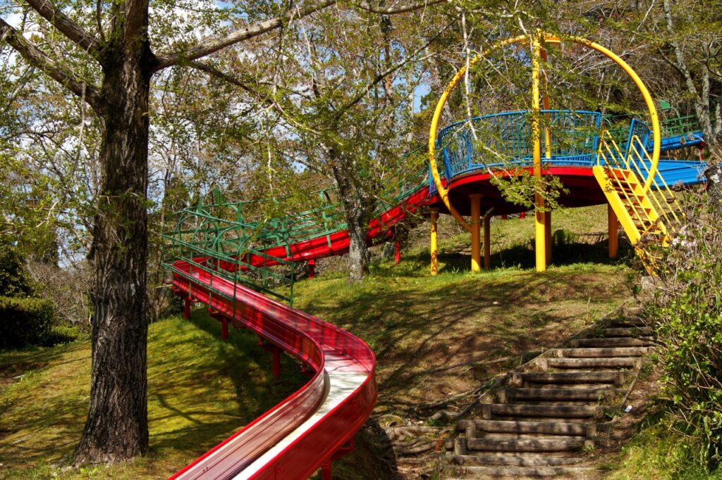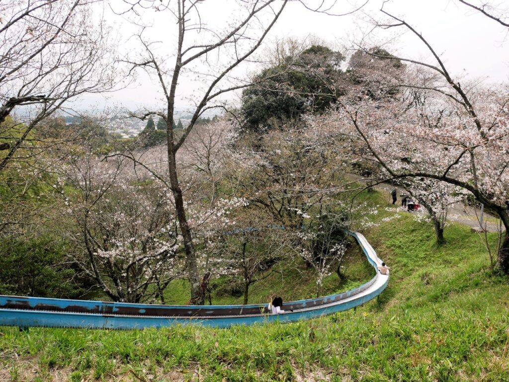 园内以染井吉野樱与八重樱为主,并拥有全长 130 公尺的超长滚轮滑梯。旅客可以坐在垫子上体验从樱花林间穿梭的快感,公园免费提供滑梯坐垫,不过自行携带可能有更畅快的滑行体验。